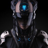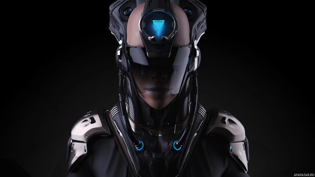 a humanoid robot with a highly detailed and advanced design. It has a helmet-like headpiece that covers the entire head and features