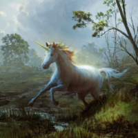 tale setting. The unicorn is running across a verdant landscape, with mist and clouds adding to