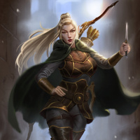 a quiver of arrows on her back, indicating she may be an archer or warrior. Her hair is styled in a braid, and she appears to be