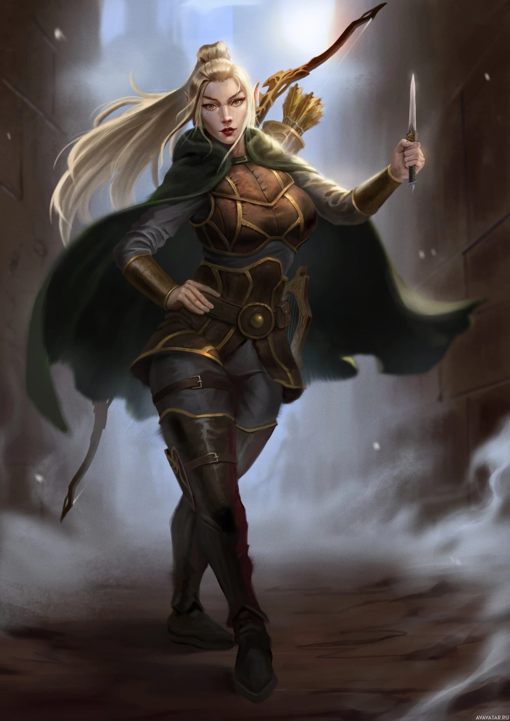 The image depicts a fantasy-themed character. She is dressed in medieval-style armor with a cloak and carrying