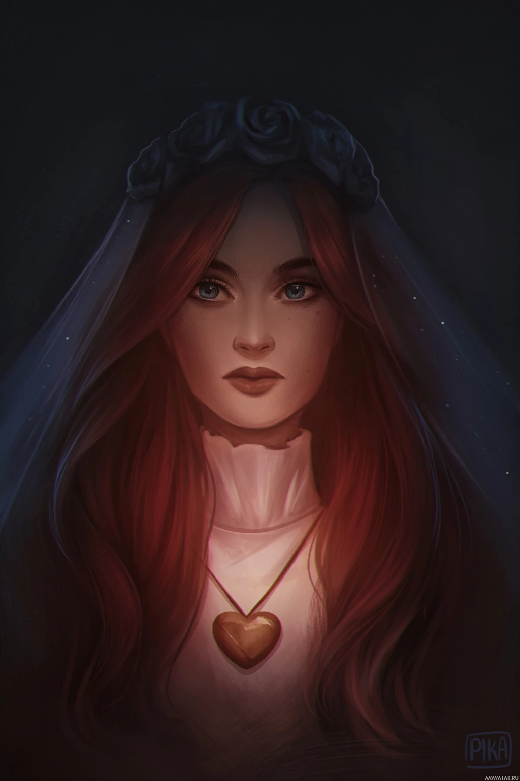 a contemplative expression. On her head, she has a tiara that suggests a royal or significant status, and around her neck, there's a heart-