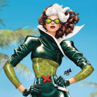 На картинке изображена героиня женского пола в облегающем черном костюме с зелеными и золотыми вставками, напоминающая супергероиню Роуг из комиксов "Люди Икс". На ней также солнцезащитные очки, а волосы уложены в модной манере. Обстановка напоминает пляж на закате или восходе солнца, учитывая теплое освещение и пальмы, видимые на заднем плане.