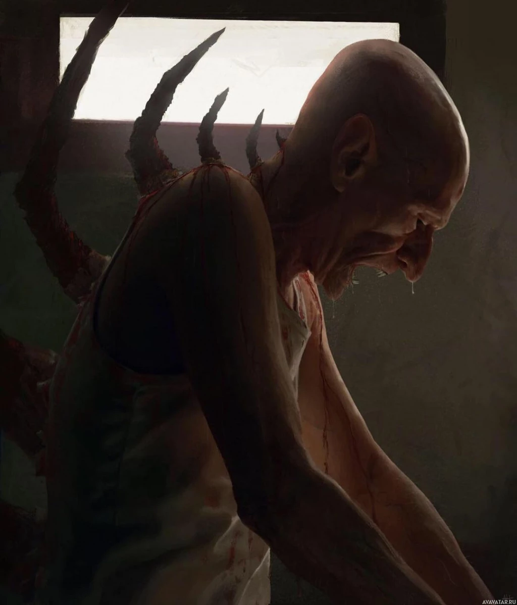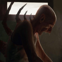 a horror genre. The person has a severely distressed or horrified expression, with tears streaming down their face. They are holding what seems to be a piece of their own flesh or an object covered in blood and viscera, suggesting a violent or gruesome event has occurred. The setting looks like a dilapidated room with peeling paint, which adds to