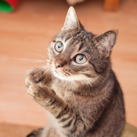 human behavior like clapping hands. The cat's fur has stripes typical of