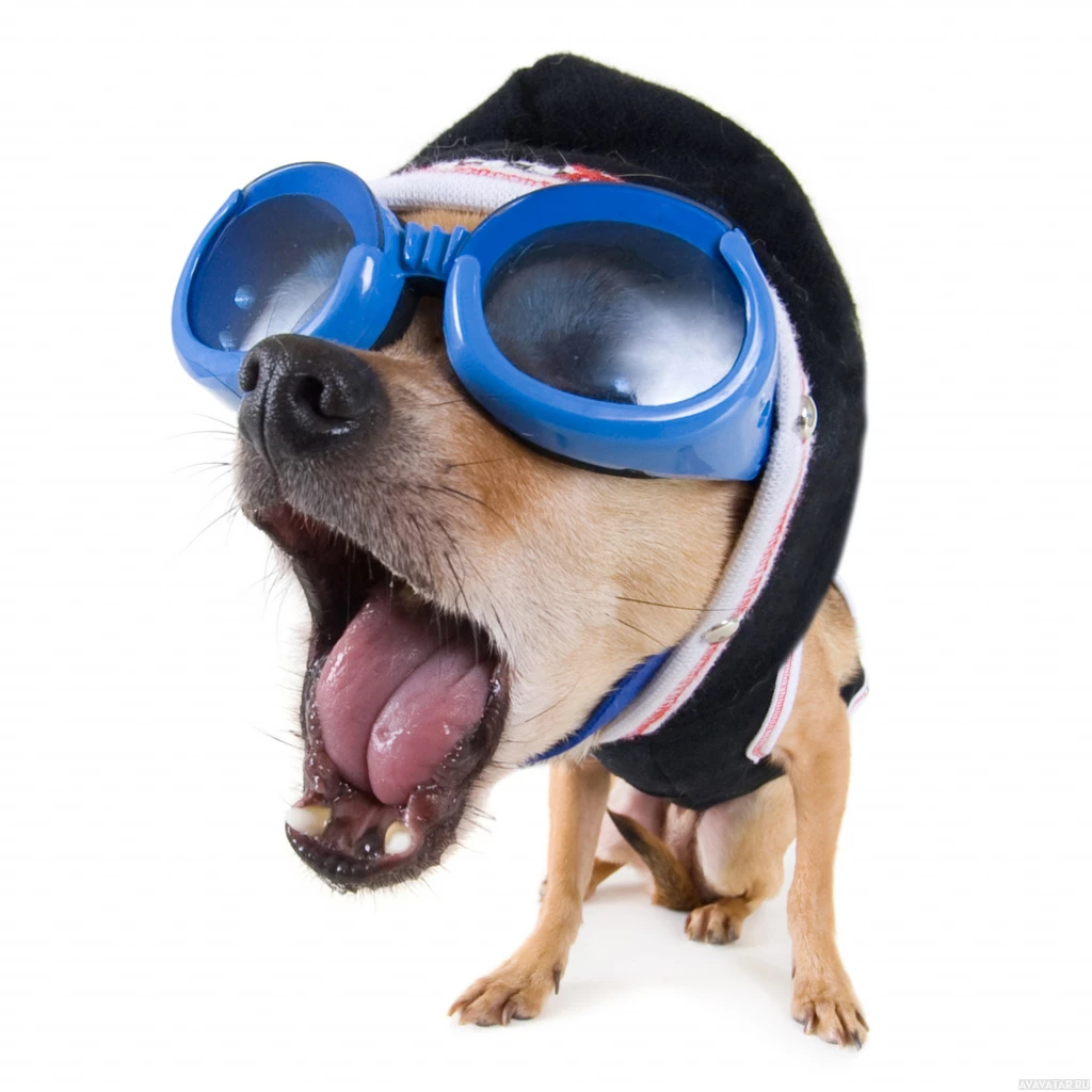 На картинке изображена маленькая собачка, возможно, чихуахуа или похожей породы, в маске для подводного плавания и шапочке для плавания на голове. У нее преувеличенное выражение лица, рот широко открыт, как будто она кричит или издает громкий звук. Фон - простой белый, который подчеркивает наряд и выражение лица собаки.
