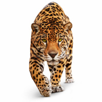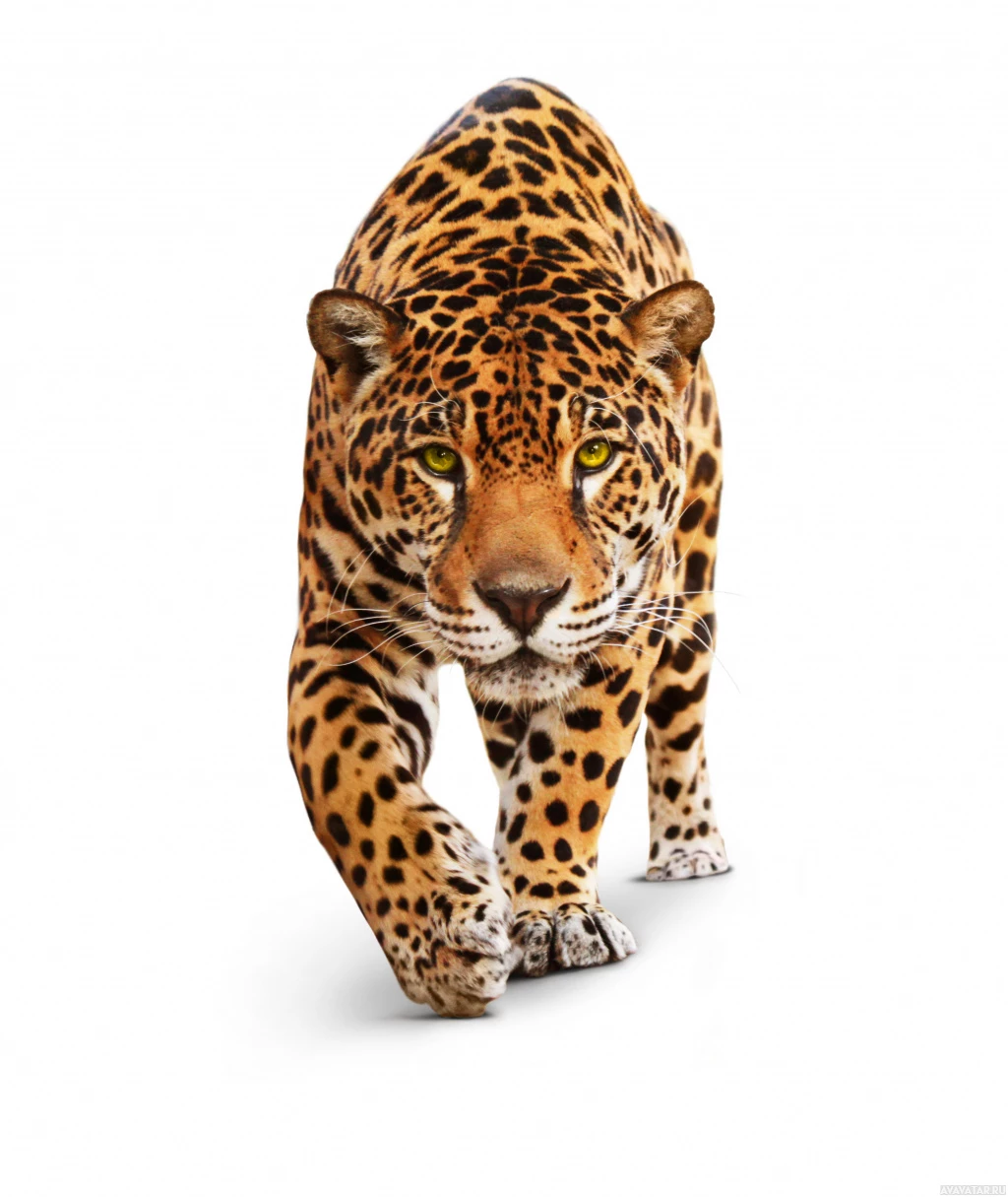 На картинке изображен леопард, идущий, как представляется, по белому фону. Отчетливо виден характерный рисунок шерсти леопарда - черные розетки на более светлом фоне, а также его внимательный и сосредоточенный взгляд.