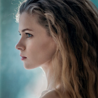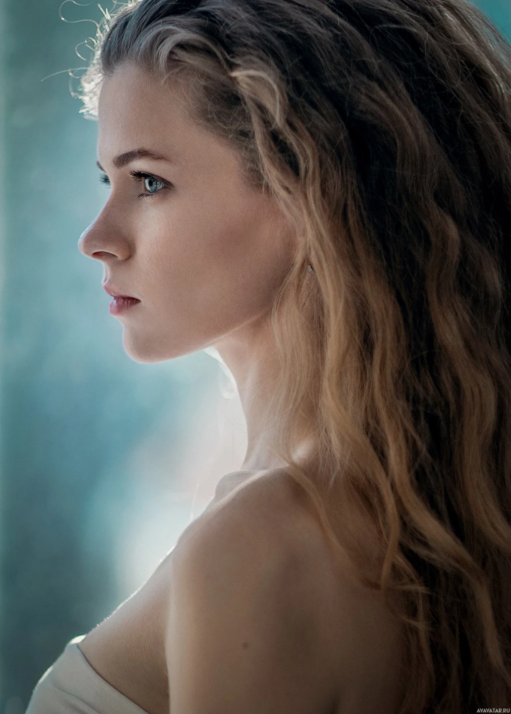 a young woman looking off to the side with a contemplative expression. Her hair is long and it appears to be either blonde or light brown, depending on the lighting in the photo. She has