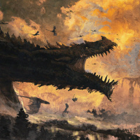 a fantastical scene featuring a dragon. The dragon is shown with its wings spread wide and its mouth open in a roar, set against a backdrop that appears to be an apocalyptic or dramatic sky with