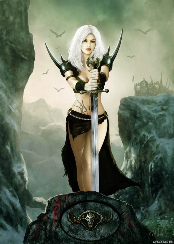 На картинке изображена женщина с белыми волосами и мечом, стоящая в драматической позе на вершине того, что кажется камнем или каменной структурой. Она носит доспехи и держит меч в вертикальном положении. Есть фантастическая или приключенческая тема, подразумеваемая ее одеждой и обстановкой. Художественный стиль предполагает, что это может быть из видеоигры или аналогичного носителя.