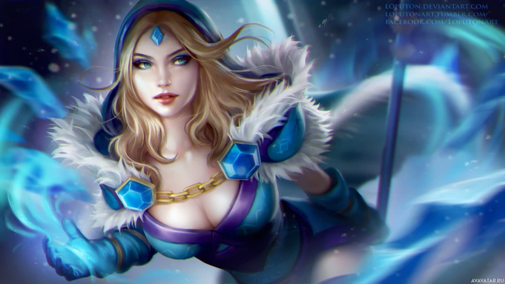 blonde hair and blue eyes. Her attire consists of a fur-lined top with a gem emblem on her chest, suggesting she might be associated with magical or mystical powers within the game's universe. The background includes what appears to be