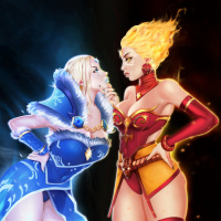 Crystal Maiden, identifiable by her blue and white color scheme with a floating crystalline form. She appears to be casting a spell or using her abilities. On the right, there's Lina, known for her red and gold armor, a fiery aura around her hands, and the ability to cast