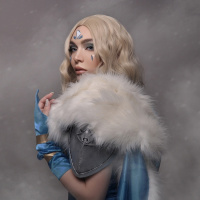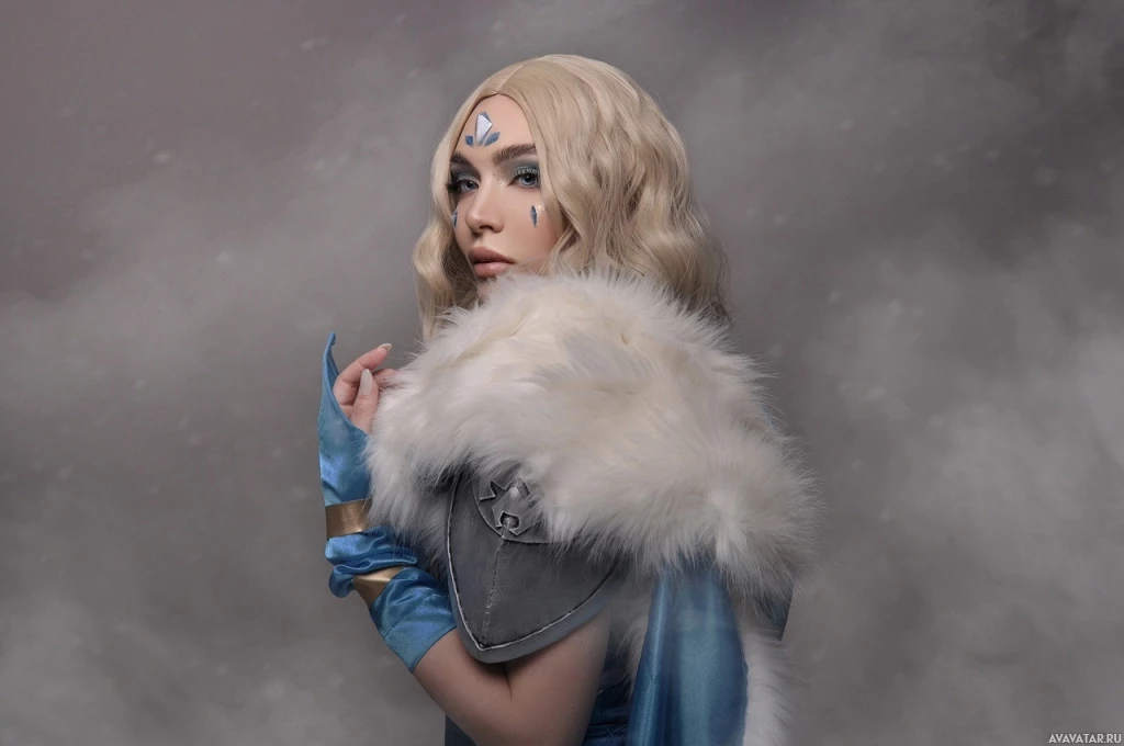Crystal Maiden, a character from the popular game Dota 2. The individual is wearing a costume that includes a fur-lined coat with