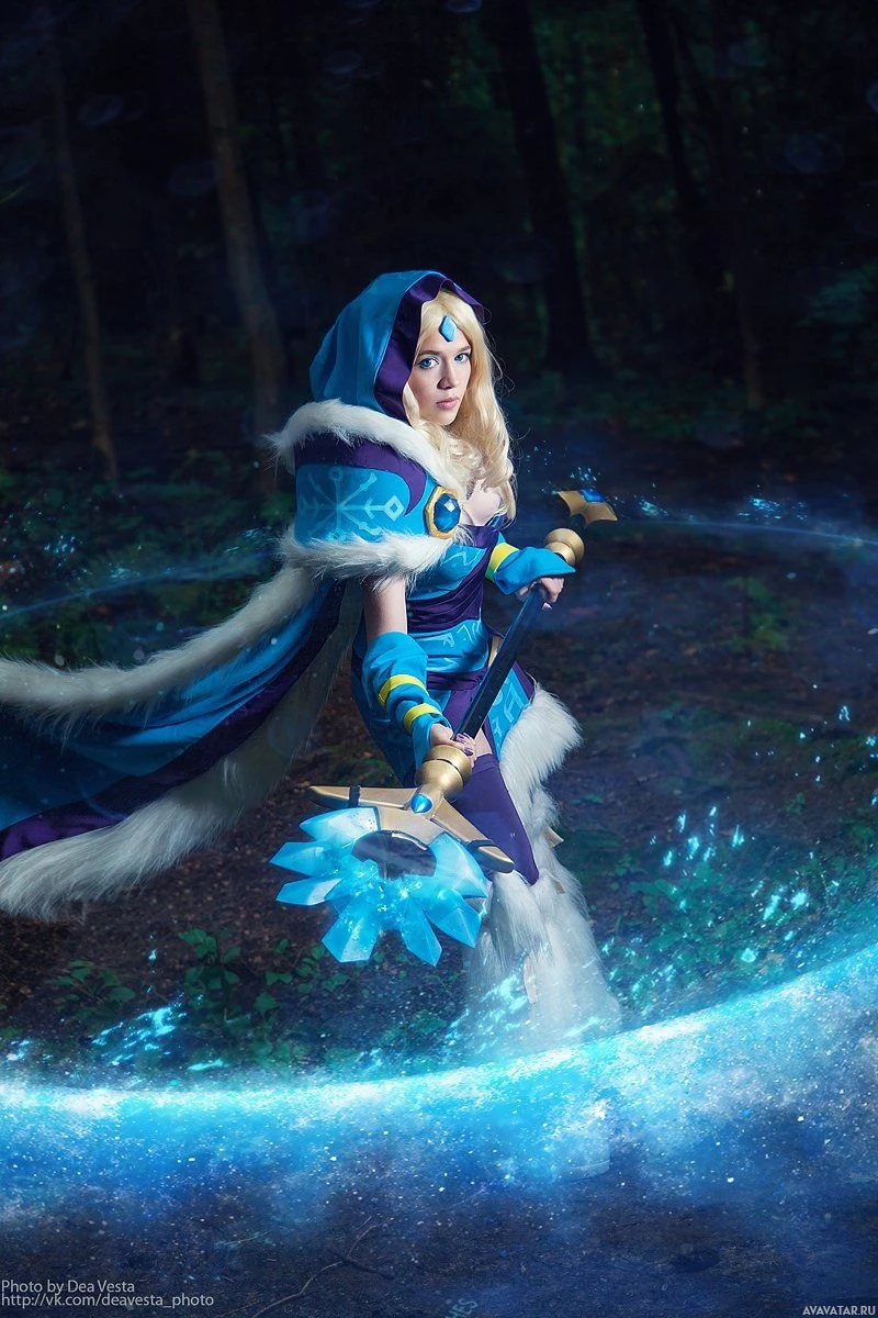 Crystal Maiden from the multiplayer online game Dota 2. They are wearing a fantasy-style costume that includes a cloak,