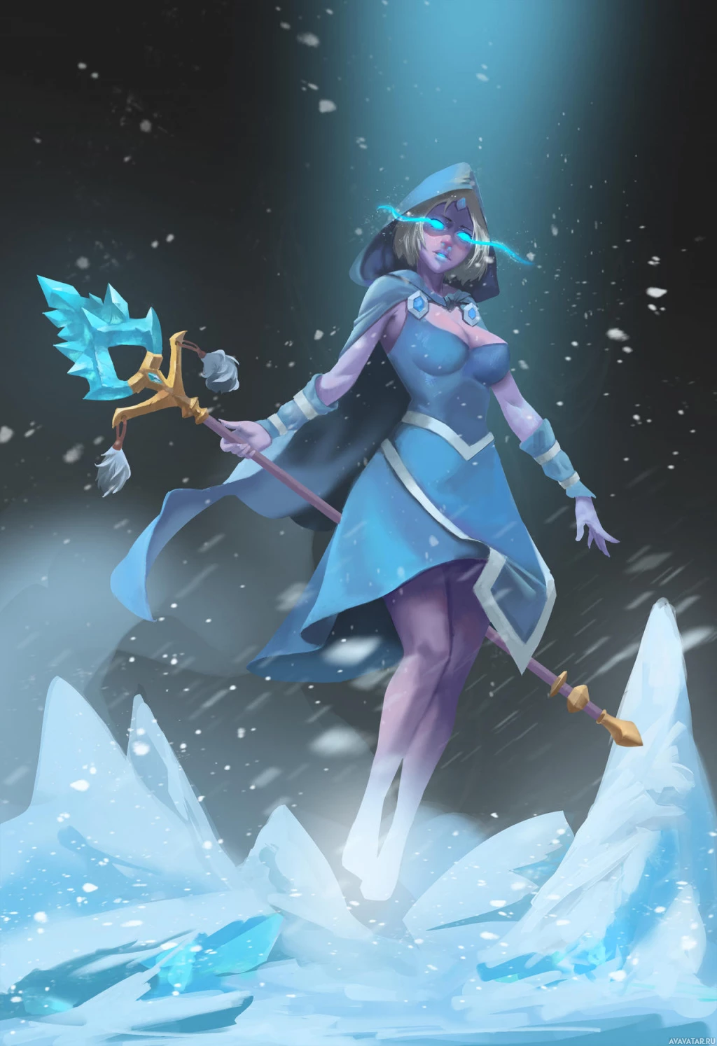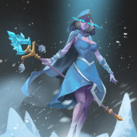 На картинке изображен анимационный персонаж, известный как Crystal Maiden из игры Dota 2. Она изображена в динамичной позе, с посохом в руках, стоящей на сооружениях, похожих на лед. Судя по ее одежде, у нее есть какие-то магические или фантастические способности, связанные с кристаллами или льдом. Общая обстановка, по-видимому, создается в условиях сильного холода в ночное время, о чем свидетельствует темный фон.