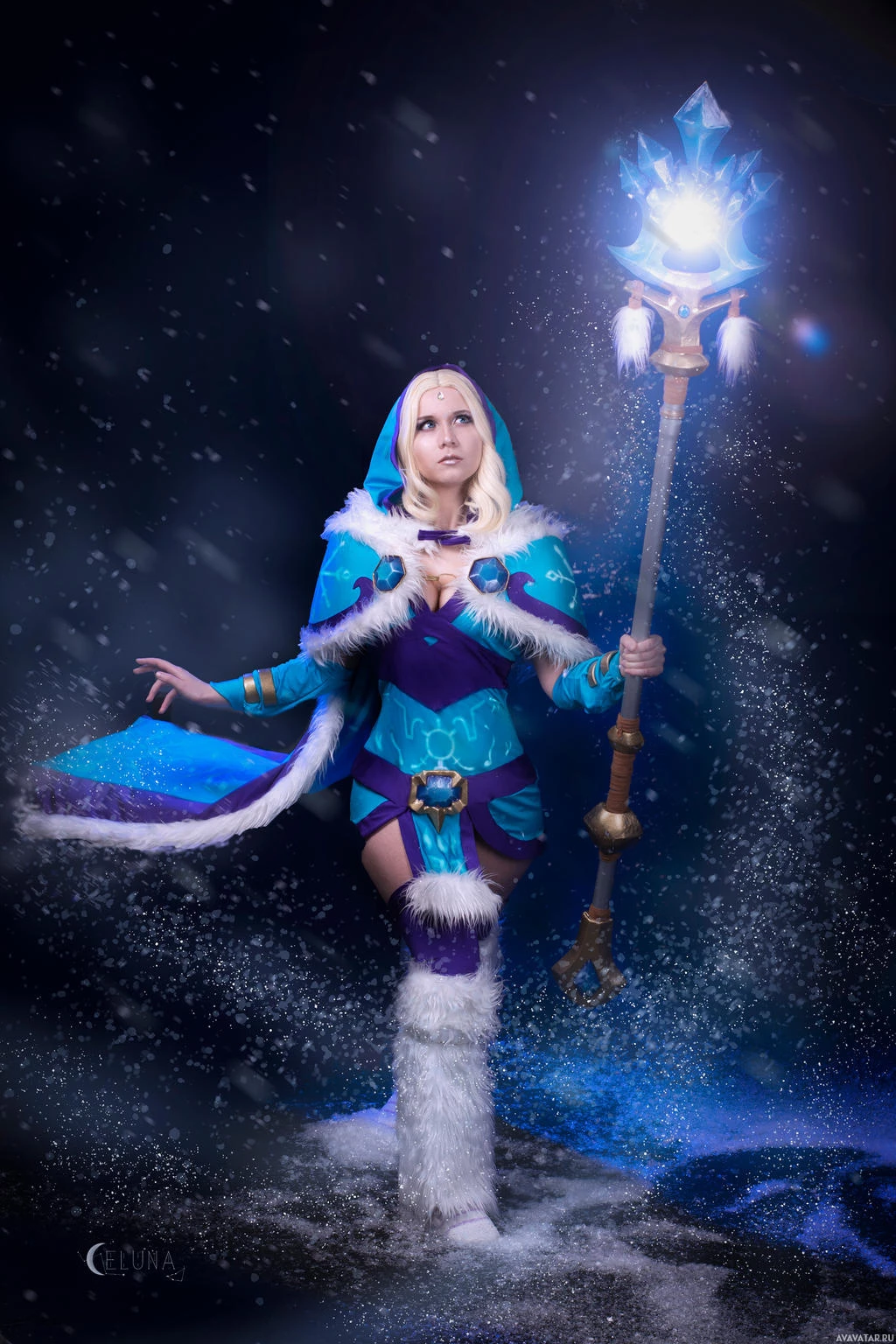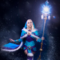 Crystal Maiden, a character from the game "Dota 2." The individual is wearing a costume that mimics the character's appearance, complete with a cloak, fur details, and holding a staff. The background suggests a magical or fantasy setting with falling snowflakes, enhancing