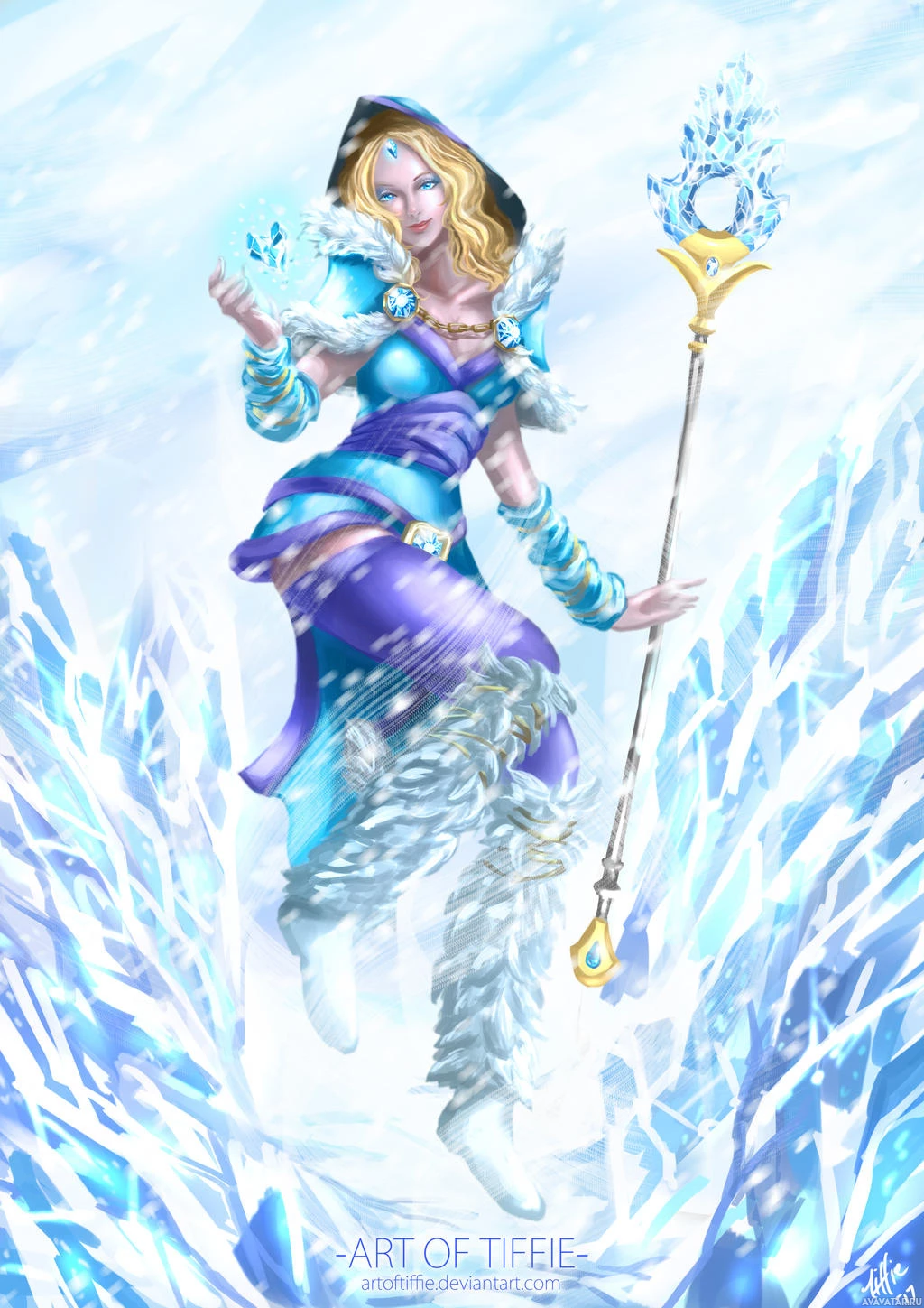 blonde hair and is wearing a fantasy outfit that includes a blue dress, boots with fur trim, and a staff with a crystal on top. The background features ice or crystal formations, which aligns with her character's abilities in the game to create and manipulate ice and crystals.
