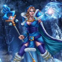 Crystal Maiden is wearing a blue and white outfit with a fur-lined cape, which is characteristic of her design within the game. The character is holding a staff that appears to be emitting