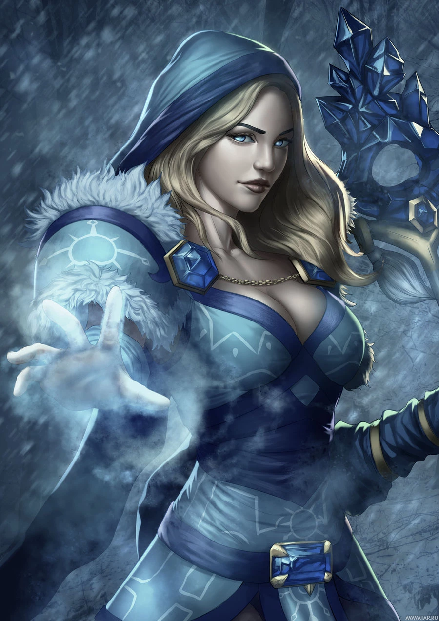 This is an image of a female character from the video game Dota 2. She is styled as Crystal Maiden, which is one of the heroes in the game. The character is depicted with blonde hair and is wearing a blue and white outfit that includes a fur-lined hood. In her hands, she holds a staff adorned with crystals, which is part of her unique abilities within the game.