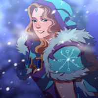 a hero in the game, represented by her distinctive appearance and attire that typically includes crystals and ethereal elements. In this particular illustration, she is shown with