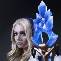 In the image, there is a woman posing as Crystal Maiden from the game Dota 2. She is wearing the character's signature outfit and holding a staff topped with a blue crystal. The setting suggests she might be participating in or celebrating cosplay related to the game.