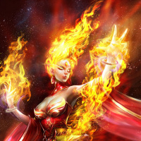 The image depicts an animated character from the game Dota 2, known as Lina. She is a powerful wizard who specializes in casting spells that involve elements such as fire and lightning. In this particular artwork, she is shown with flames surrounding her hands and body, suggesting a focus on her abilities to manipulate fire magic.