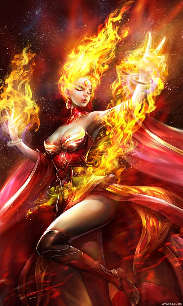 На картинке изображен анимированный персонаж из игры Dota 2, известный как Лина. Она могущественный волшебник, специализирующийся на произнесении заклинаний, в которых задействованы такие элементы, как огонь и молния. На этом конкретном рисунке она изображена с языками пламени, окружающими ее руки и тело, что говорит о ее способности манипулировать магией огня.
