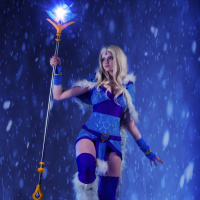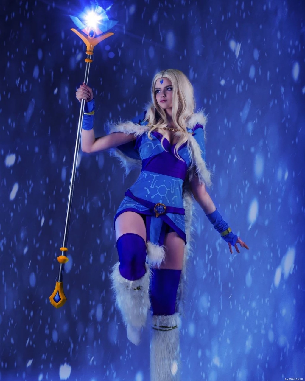 Crystal Maiden, a character from the game Dota 2. The individual is holding what appears to be an enchanted crystal or weapon with