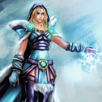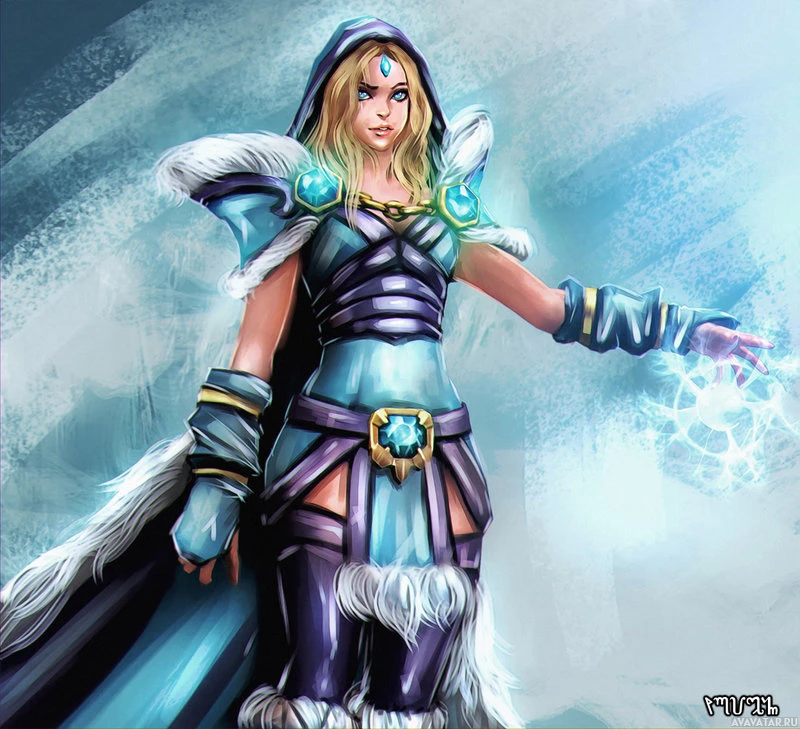 the video game "Dota 2," known as Crystal Maiden. She is a magical warrior characterized by her armor and amulet, which feature crystalline elements that give off