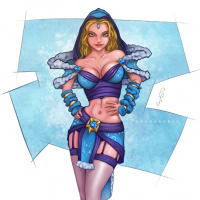 a female character from the game Dota 2, known as Crystal Maiden. She is dressed in a fantasy-themed outfit with elements that resemble ice and snow. Her attire includes blue and white colors that give her a cool and mystical appearance, fitting for a character who might be associated with cold environments or