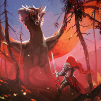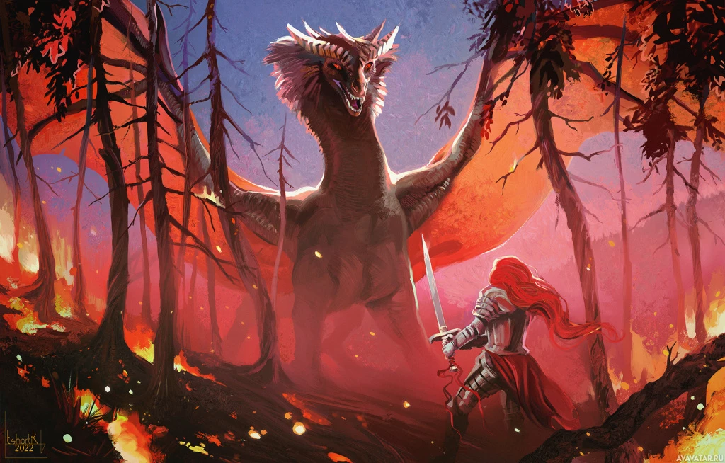 character on the right appears to be standing behind the dragon, looking out towards the viewer. There's also a red haired character who might be another member of the knight's party or