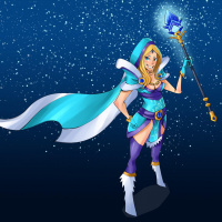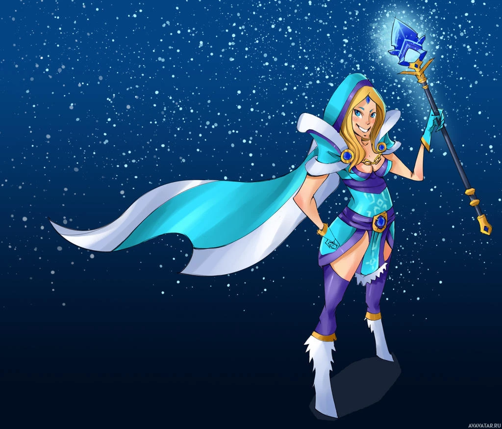Crystal Maiden, and she is known for her role as a supportive hero in the game. She is depicted holding a staff with a crystal on top, which reflects her abilities to heal and protect teammates, and her costume includes