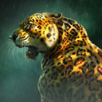 a dramatic atmosphere. The lighting is focused on the jaguar's face, highlighting its features and creating
