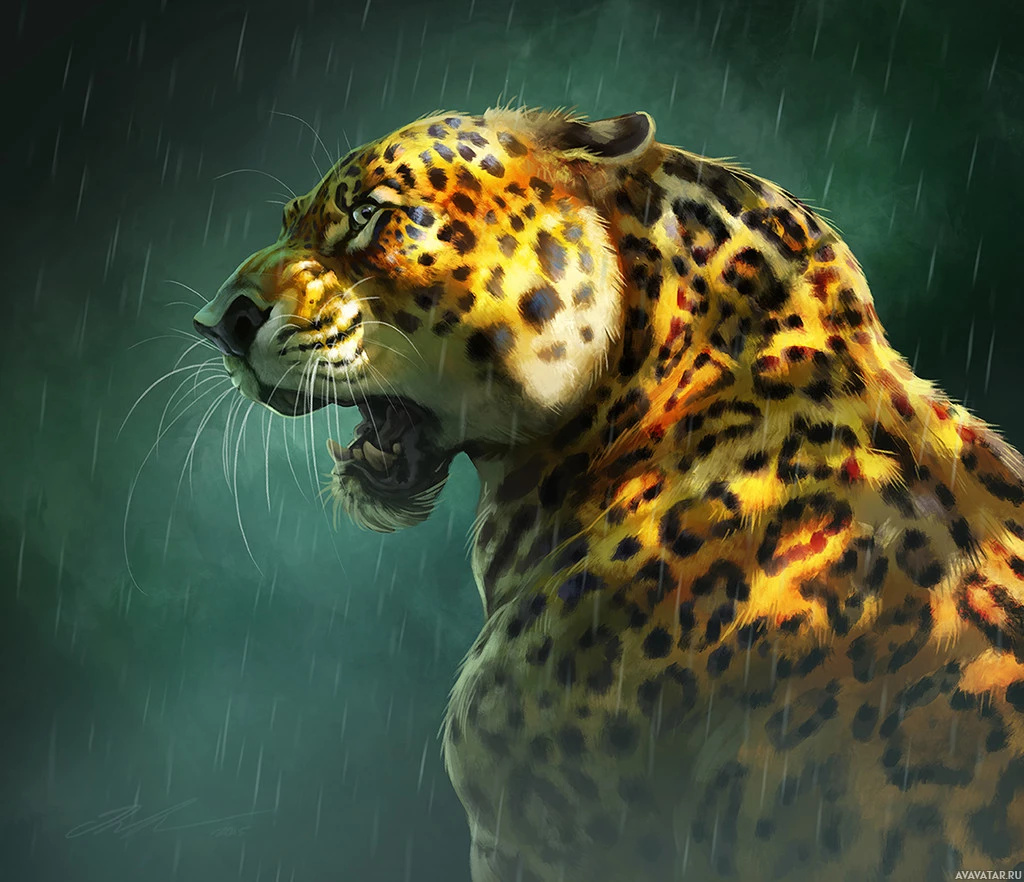 an intense moment. It appears to be roaring or yawning wide, which could suggest aggression or excitement. The background is dark and moody, with rain falling, contributing to