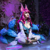 the video game "League of Legends." The individual is seated with a fox-like tail and ears, which are characteristic of Ahri's appearance in the game. They are wearing a costume that includes elements of blue, pink, and white, colors that match