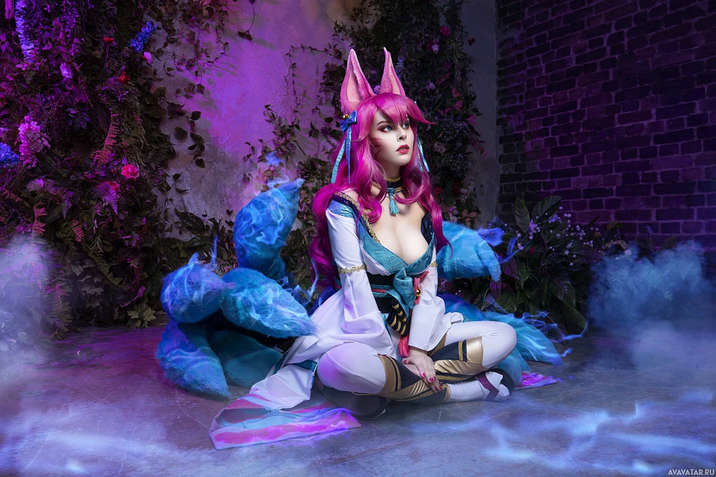 This image features a person cosplaying as Ahri, a character from