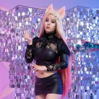 In the picture, there is a person dressed in cosplay attire that resembles the character Ahri from the game "