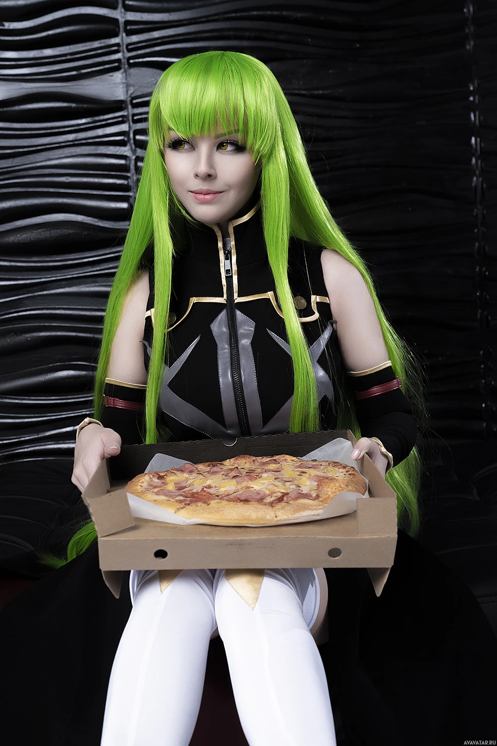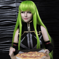 a pizza box containing a pizza. The image is likely related to the cosplay community where people dress up as characters from various media such as manga, anime,