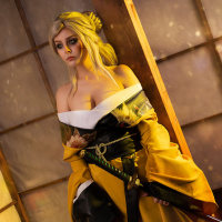 The image depicts a woman dressed in a costume that appears to be inspired by the character Ciri from "The Witcher"