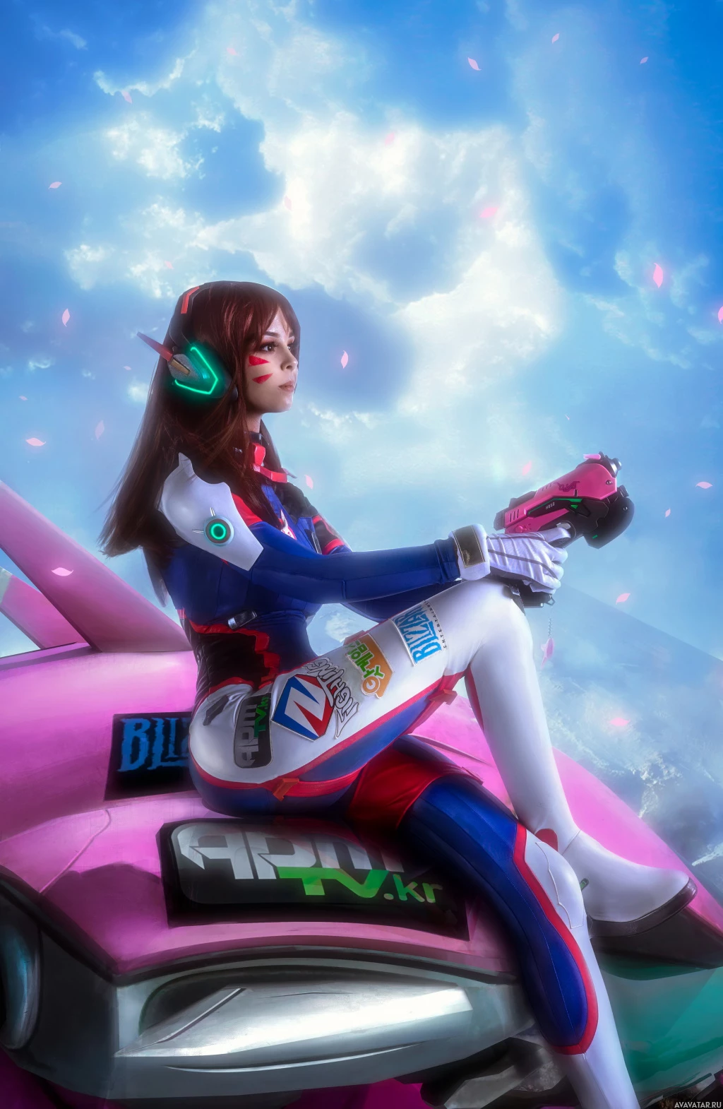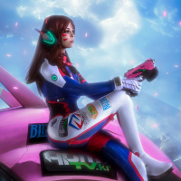 sky with clouds, giving it a fantasy or futuristic feel. It's worth noting that the character is holding what looks like a hammer, which is one of D.Va's primary weapons in the game, and she also has a headset on her ears, possibly representing her