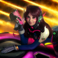 the video game "Overwatch" named D.Va. She is wearing her armor and holding what appears to be a weapon, suggesting she might be in