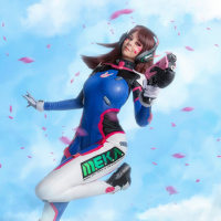 cosplay form. She is wearing her signature blue and white suit with a helmet and holding a gun in her right hand while standing on one leg. There are pink flower petals scattered around her, suggesting she might be falling or landing from