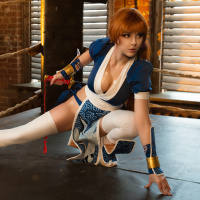 red hair and power suit, which includes armor pieces and boots designed for combat. The setting appears to be an indoor boxing ring, with ropes visible in the background, giving a sense of location and context to