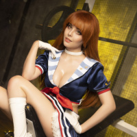 game character with red hair. They are seated on what appears to be a piece of exercise equipment, possibly a weight bench, and are dressed in a costume that includes a sailor-style top, thigh-