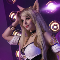 video game, specifically Ahri. The person in the photo has styled their hair like Ahri's and is dressed in a costume that resembles her attire from the game. They are seated on what appears to be a stool with a futuristic or