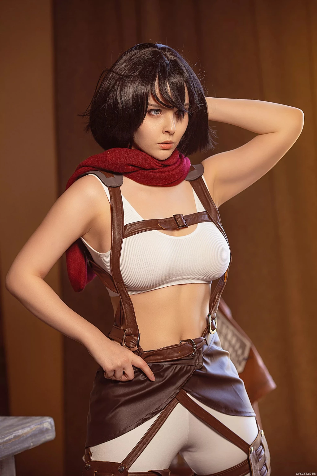 a red scarf draped around her shoulders. The character is known for her