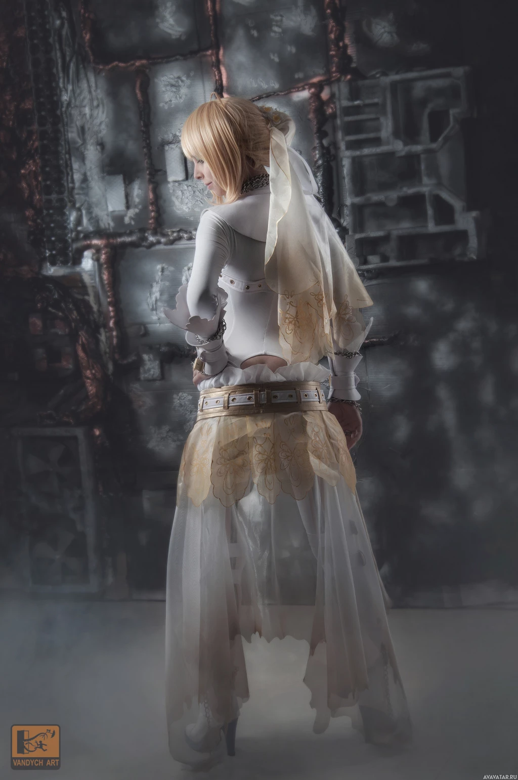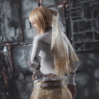 blonde hair and is wearing an elaborate costume that includes a skirt, gloves, and a top. She is also holding what seems to be a prop or item related to her character's theme. The setting suggests it might be a photoshoot or