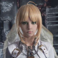 a young woman with blonde hair and green eyes. She appears to be wearing cosplay attire, which typically imitates the style of characters from anime, manga,