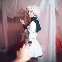 The image shows a person cosplaying as a character with white hair and wearing an outfit that suggests they are portraying a character from