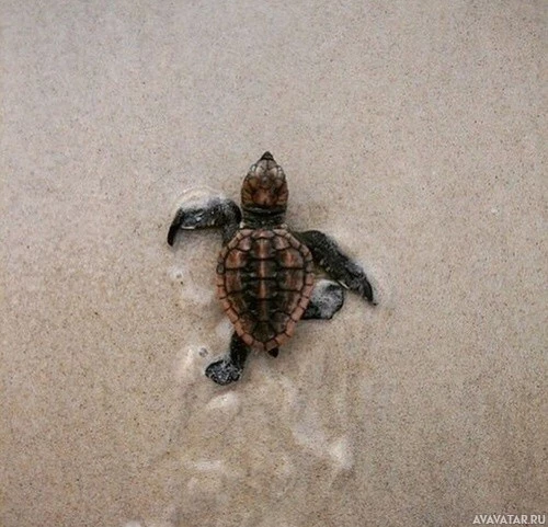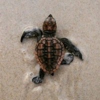 particular turtle has a coloration consistent with hatchlings, with a darker body and lighter head and flippers, commonly referred to as "scutes."