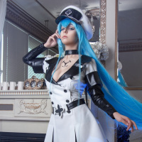 blue hair and is wearing a costume that appears to be inspired by a character with a military-style uniform and a large hat with some sort of emblem on it. The outfit includes a tie and what looks like badges or insignias. There's also a hint of what could be a choker or necklace visible around the neck area. The setting suggests